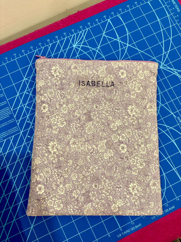 The iPad cover shown here is a custom order for an iPad Air. Our customer wanted 2 different Liberty fabrics, the classic Emily Belle print for the front and and an equally elegant print for the back. She also specifically wanted a purple zipper and her name on the front.