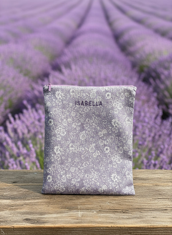 The iPad cover shown above is a custom order for an iPad Air. Our customer wanted 2 different Liberty fabrics, the classic Emily Belle print for the front and and an equally elegant print for the back. She also specifically wanted a purple zipper and her name on the front.