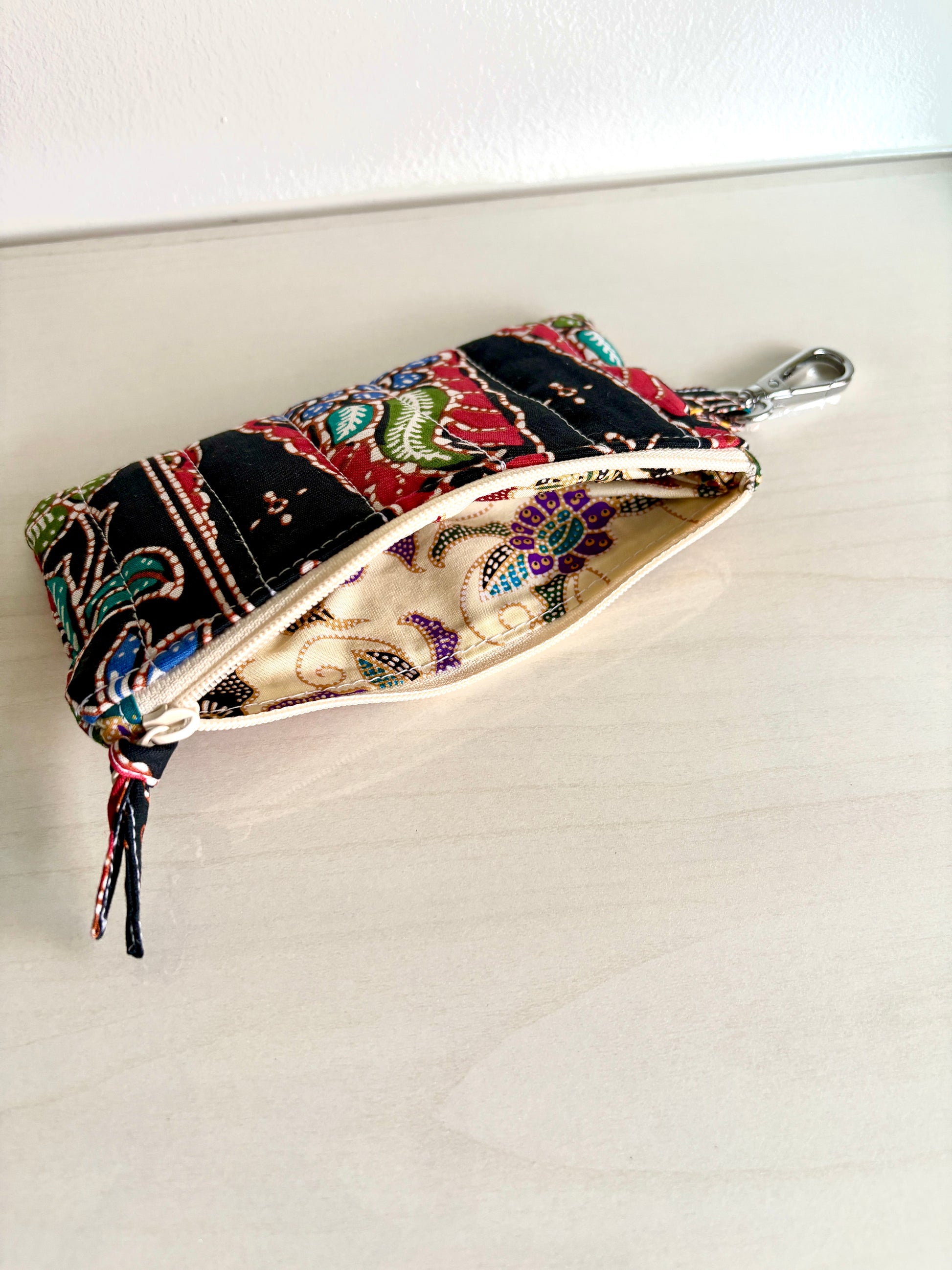This stylish, quilted Batik purse can fit multiple cards, cash, coins and all your small essentials, including keys, lipstick, earphones, etc.